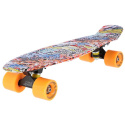 Pennyboard NILS Extreme ART MORO má celoplošný maskáčový design. Zelené trucky drží průhledná kolečka s logem výrobce.