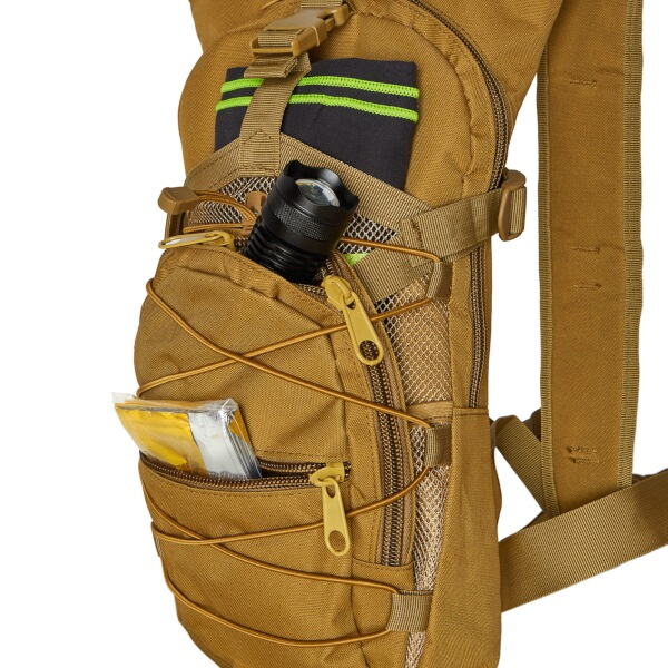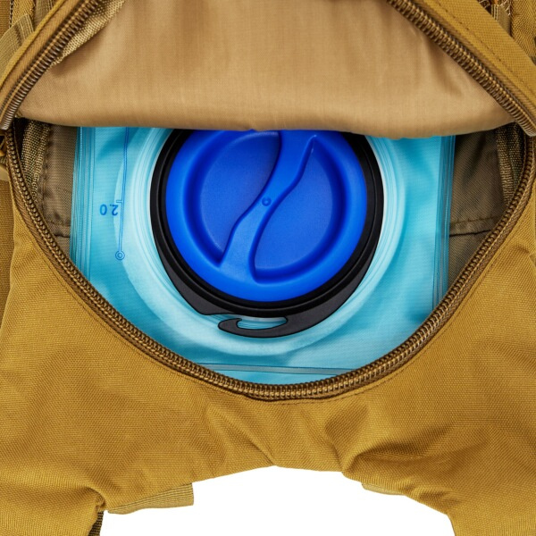 Hlavní komora batohu je opatřena přepážkou, v horní části se nachází 2 karabiny pro zavěšení hydrovaku (není součástí dodávky). Hadičku hydrovaku lze vyvést průvlaky na pravé i na levé straně pod ramenními panely. Na hlavní komoře se nacházejí další úložné prostory a to velká síťovaná kapsa s popruhem a přezkou - menší otevřená, síťovaná kapsa - 2. komora na zip - kapsa na zip (například pro mobilní telefon a peněženku) a gumová šňůra s brzdičkou, pod kterou lze přenášet například cyklistickou helmu, nebo karimatku. Po stranách batohu se nachází kompresní popruhy, které stahují hlavní komoru a obě síťované kapsy. Na horní straně je robustní ucho pro pohodlné přenášení batohu v ruce. Zadní strana a ramenní popruhy jsou polyesterové bez polstrování. Na popruzích je gumové poutko k provlečení hadičky hydrovaku a hrudní popruh, ten je výškově a délkově nastavitelný. Bederní popruh s robustní přezkou má šířku 3,5 centimetru.