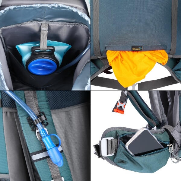 Hlavní komora se z horní části uzavírá stahovací šňůrkou s brzdičkou a vrchlíkem na 2 plastové přezky, ze spodní části lze do komory přistoupit pomocí klopy opatřené dvoucestným zipem. Po stranách batohu jsou síťované kapsy s gumičkou v lemu, nad kapsami se nachází délkově nastavitelné popruhy, pod které lze umístit například vyšší láhev, nebo karimatku. Z čela batohu se nachází 2 gumová poutka a 2 smyčky pro přenášení turistických holí, 7 poutek pro zavěšení například kempingového vybavení nebo blikačky pro zvýšení viditelnosti za šera. Další 2 kapsy na jednocestný zip mají své místo na bederním popruhu. Ve spodní části batohu jsou dodatečné 2 délkové nastavitelné popruhy, které prochází plastovým okem a jsou tedy rozděleny na 2 sekce, pod tyto popruhy lze umístit další vybavení, jako například menší stan, městský batoh apod.