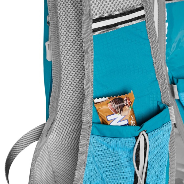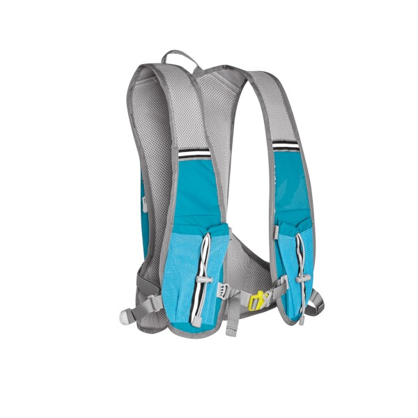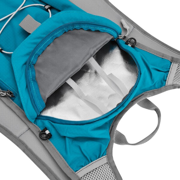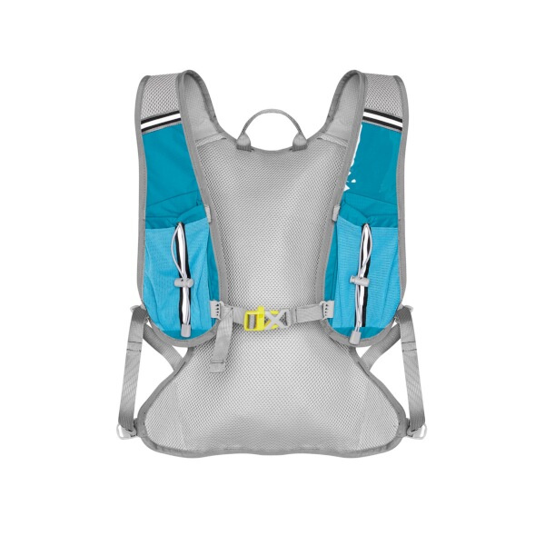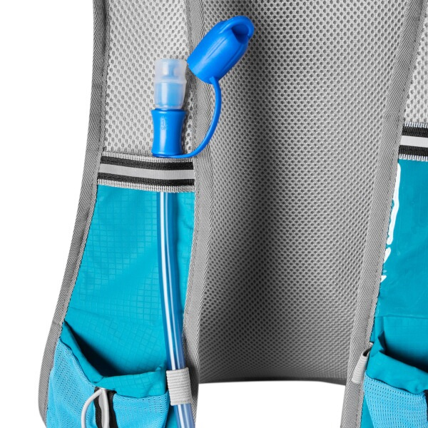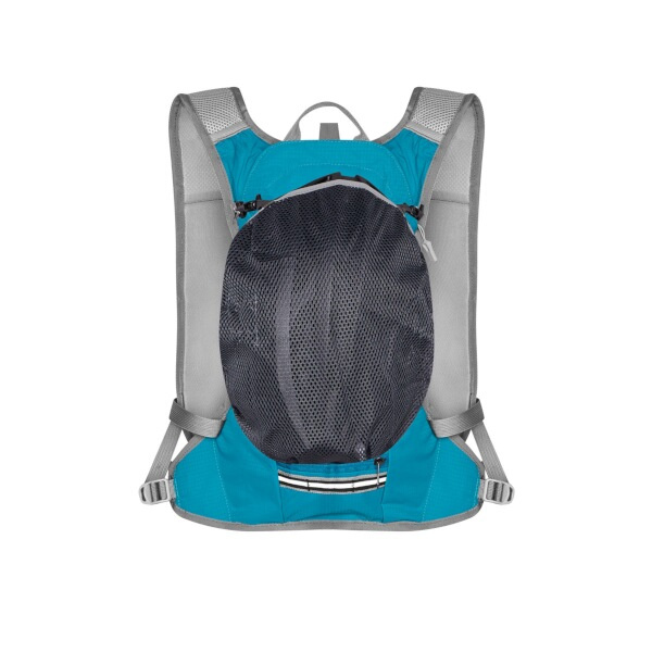 Hlavní komora batohu je opatřena přepážkou, v horní části se nachází 2 suché zipy pro zavěšení hydrovaku (není součástí dodávky). Zadní strana hlavní komory je opatřena hliníkovou fólií, která slouží jako izolace mezi hydrovakem a zády, takže nápoj se nebude ohřívat teplem od zad. Hadičku hydrovaku lze vyvést průvlaky na pravé i na levé straně pod ramenními panely. Přední strana batohu je opatřena gumovým lankem s brzdičkou, pod které lze uložit například karimatku. Níže nalezneme kapsu, ve které se skrývá síťka, kterou lze vytáhnout a pomocí karabinek připnout ke stranám batohu, síťka následně vytvoří kapsu, co které můžeme uložit například cyklistickou helmu, ešus apod.. Pod kapsou je reflexní panel, ke kterému si můžeme připnout další vybavení. Na pravé straně se skrývá další kapsa na zip, která je ideální pro telefon, peněženku, nebo například klíče. Na horní straně batohu je poutko pro snadné přenášení batohu v ruce. Záda a ramenní popruhy jsou vyrobeny ze síťoviny doplněné o prodyšnou pěnu, která zvyšuje prodyšnost panelu a záda se budou méně potit. Ramenní popruhy jsou opatřeny reflexními řemínky pro protažení hadičky od hydrovaku a kapsami ze síťoviny. Na levém popruhu se navíc nachází kapsička s průhlednou čelní stranou, do které lze uložit například kartičku pro případ ztráty, startovní číslo a podobně. Ramenní popruhy jsou spojeny hrudním pásem, který lze výškově nastavit. Popruh je spojen plastovou přezkou s píšťalkou.