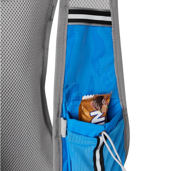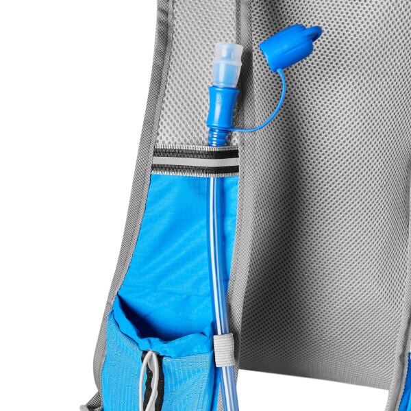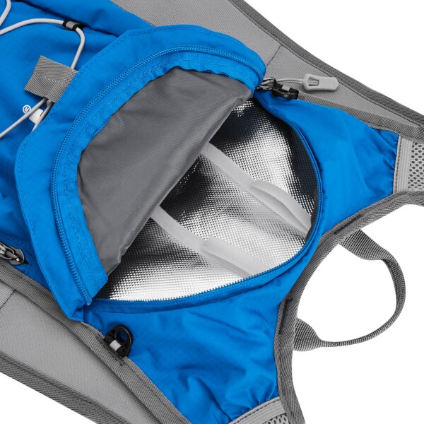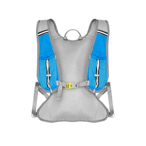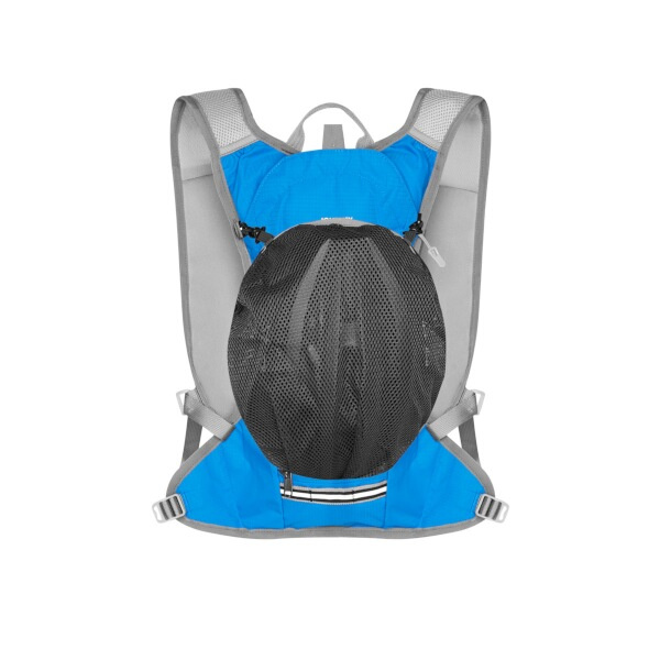Hlavní komora batohu je opatřena přepážkou, v horní části se nachází 2 suché zipy pro zavěšení hydrovaku (není součástí dodávky). Zadní strana hlavní komory je opatřena hliníkovou fólií, která slouží jako izolace mezi hydrovakem a zády, takže nápoj se nebude ohřívat teplem od zad. Hadičku hydrovaku lze vyvést průvlaky na pravé i na levé straně pod ramenními panely. Přední strana batohu je opatřena gumovým lankem s brzdičkou, pod které lze uložit například karimatku. Níže nalezneme kapsu, ve které se skrývá síťka, kterou lze vytáhnout a pomocí karabinek připnout ke stranám batohu, síťka následně vytvoří kapsu, co které můžeme uložit například cyklistickou helmu, ešus apod.. Pod kapsou je reflexní panel, ke kterému si můžeme připnout další vybavení. Na pravé straně se skrývá další kapsa na zip, která je ideální pro telefon, peněženku, nebo například klíče. Na horní straně batohu je poutko pro snadné přenášení batohu v ruce. Záda a ramenní popruhy jsou vyrobeny ze síťoviny doplněné o prodyšnou pěnu, která zvyšuje prodyšnost panelu a záda se budou méně potit. Ramenní popruhy jsou opatřeny reflexními řemínky pro protažení hadičky od hydrovaku a kapsami ze síťoviny. Na levém popruhu se navíc nachází kapsička s průhlednou čelní stranou, do které lze uložit například kartičku pro případ ztráty, startovní číslo a podobně. Ramenní popruhy jsou spojeny hrudním pásem, který lze výškově nastavit. Popruh je spojen plastovou přezkou s píšťalkou.