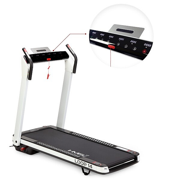 Trenažér je vybaven motorem o výkonu 2,5 HP, který dokáže rozpohybovat běhoun na maximální rychlost 14 km/h. LOOP14 také disponuje automatickou regulací sklonu v rozsahu 0 - 12° pro simulaci běhu v terénu. Běžecká plocha o rozměrech 130 x 48 cm je na 6 místech odpružena pomocí silikagelových silentbloků, které snižují zatěžování kloubů při běhu. Konzole jde pomocí nášlapné pojistky snadno sklopit k zadní hraně trenažéru a po sklopení získáme rozměr 146 x 75 x 27 cm a trenažér se tak vejde za skříň, nebo pod postel. Přesouvání modelu LOOP14 navíc ulehčují 2 páry koleček. První pár se nachází na spodní hraně a po zvednutí zadní části pásu umožňují pohyb vpřed a vzad. Druhý pár koleček se nachází na čele trenažéru a po jeho zvednutí do kolmé pozice umožňují pohyb do stran.