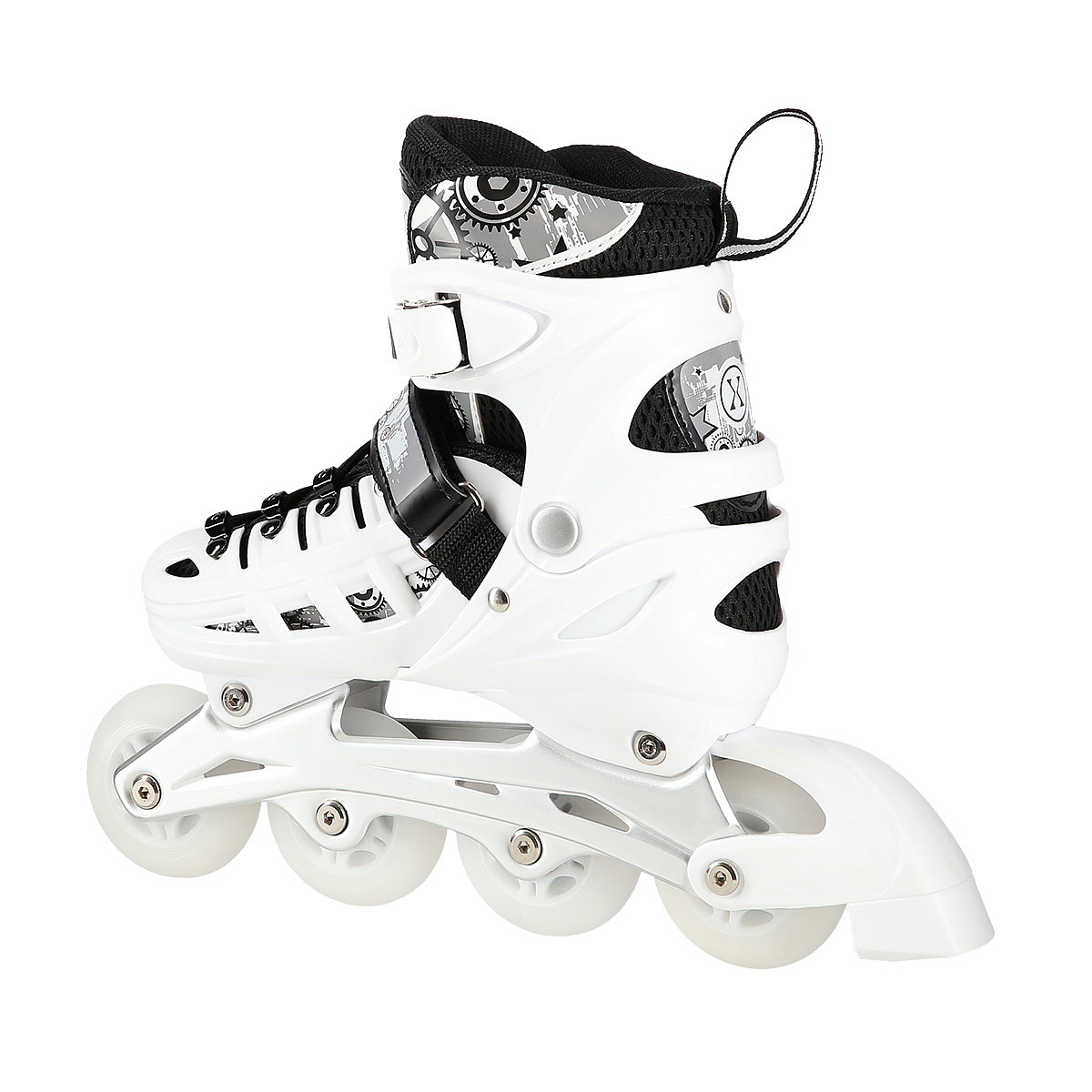 Model je vybaven praktickým systémem čtyřstupňové regulace velikosti – jednoduchým stisknutím tlačítka pod patou lze posunout špičku boty a nastavit jednu ze čtyř velikostí. Tento systém umožňuje, aby brusle rostly spolu s dítětem a současně snižuje celkové náklady na vybavení.