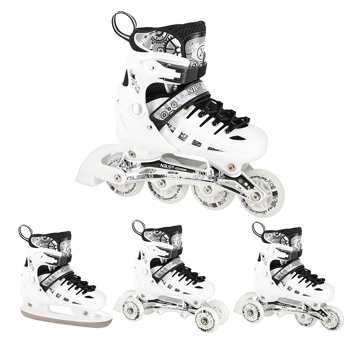 Brusle NILS Extreme NH10905 jsou multifunkční model, který nabízí hned 4 možnosti sestavení podvozku – jako brusle na led, in-line brusle, taneční (quad) brusle a pro nejmenší kombinaci 2+1+1 + nůž na led. Díky tomu jde o univerzální řešení, které se přizpůsobí věku i dovednostem uživatele a poskytne radost z jízdy po celý rok.