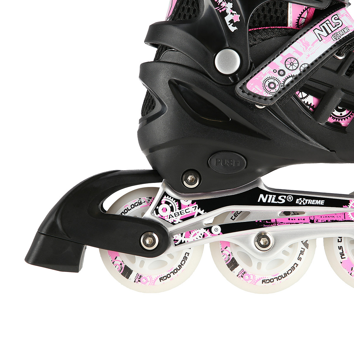 Kolečkové brusle NILS Extreme NH10905 2. generace pro začínající a poročilé bruslaře. Svítící kolečka, nůž na led, 3 možnosti uložení koleček, ložiska ABEC 7, rostoucí bota.Více