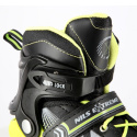 NILS Extreme NH18192 jsou kolečkové brusle 4v1 s vyměnitelným nožem na led, které jsou určeny pro začínající a středně pokročilé uživatele. Hliníkový podvozek je osazen měkkými PU kolečky s ložisky ABEC7 pro svižnou jízdu. Vnější bota je pomocí stisku tlačítka nastavitelná do čtyř velikostí, toto řešení umožňuje precizní přizpůsobení velikosti podle aktuálních potřeb anebo se používá jako "rostoucí bota", která "roste" spolu s nohou dítěte. Na špičce jsou ventilační otvory pro maximální prodyšnost. Vnitřní bota je vyrobena z kombinace semiše, síťoviny MESH, EVA a pěny o vysoké hustotě. Zapínání je řešenou klasickou trojkombinací - šněrování, řemínek se suchým zipem a dvousekční přezka. Součástí balení je sada šroubů a podložek pro přestavbu podvozku do konfigurace 2+1 a 2+2 a pár nožů na led, které jsou vyrobeny z nerez oceli s vysokým podílem uhlíku.