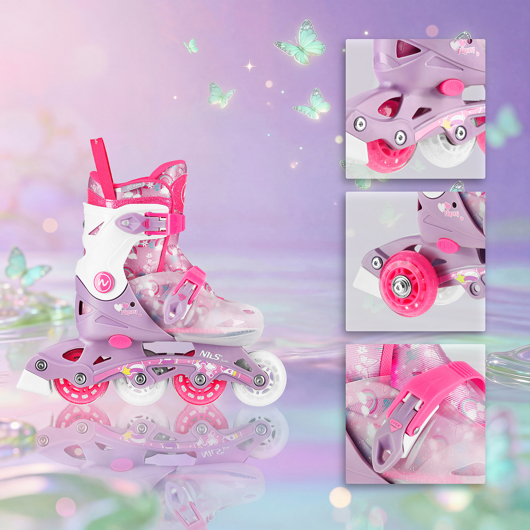 NJ1025 FLIPZY NILS Fun jsou nastavitelné inline brusle navržené pro menší děti, které s bruslením teprve začínají. Pastelové odstíny růžové a fialové, třpytivé akcenty a jemná pohádková grafika včetně motivu motýlků dodávají modelu lehký, dívčí vzhled – ideální pro první bruslařská dobrodružství.