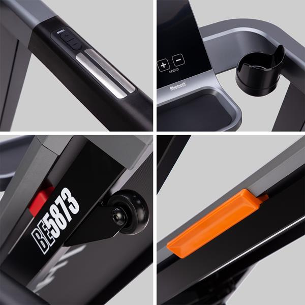 BE5873 je vybaven Bluetooth technologií, která umožňuje propojení s aplikacemi jako Kinomap, Zwift nebo AnyRun. Tyto aplikace zpestří váš trénink a zvýší vaši motivaci. Vestavěné reproduktory vám navíc umožní poslouchat oblíbenou hudbu či podcasty, takže si cvičení ještě více užijete.