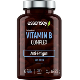 ESSENSEY B COMPLEX. Doplněk stravy. Přípravek v kapslích s obsahem vitaminů skupiny B. Riboflavin, niacin, vitamin B6 a vitamin B12 přispívají ke snížení únavy a vyčerpání. Thiamin, riboflavin, vitamin B6, vitamin B12 a biotin přispívají k normálnímu energetickému metabolismu.