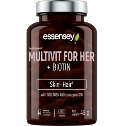 ESSENSEY MULTIVITAMIN PRO ŽENY + BIOTIN. Doplněk stravy. Přípravek v kapslích s obsahem vitaminů pro ženy,obohacený o kolagen, extrakt ze zeleného čaje, CLA, L-karnitin, kyselinu hyaluronovou a koenzym Q10. Thiamin, vitamín B6, vitamín B12, biotin a vitamín C přispívají k normálnímu energetickému metabolismu. Riboflavin, biotin a vitamin A přispívají k udržení zdravé pokožky. Biotin přispívá k udržení zdravých vlasů.
