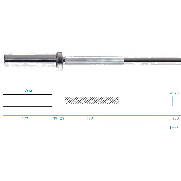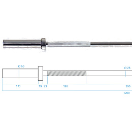 Průměr úchopové části je 28 mm a zajišťuje vysokou odolnost a pohodlí během tréninku. Použitý proces chromování hřídele je zárukou zachování jejího vzhledu po dlouhou dobu jejího používání a také je nejlepší ochranou proti korozi.