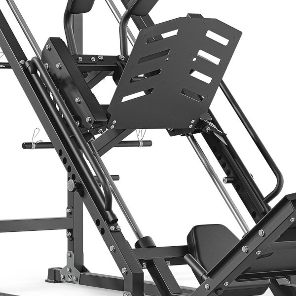 Hacken dřep / leg-press MARBO Sport MS-U106 2.0 je oblíbené posilovací zařízení, které umožňuje efektivně procvičovat svaly nohou, zejména kvadricepsy, hýždě a lýtka. Cvičení na MS-U106 2.0 spočívá ve vytlačování závaží nohama, což zapojuje více svalových skupin současně. Díky dvěma možným konfiguracím stroje, které umožňují provádět dřepy a tlaky, na něm můžete provádět komplexní trénink nohou v pohodlí domova.