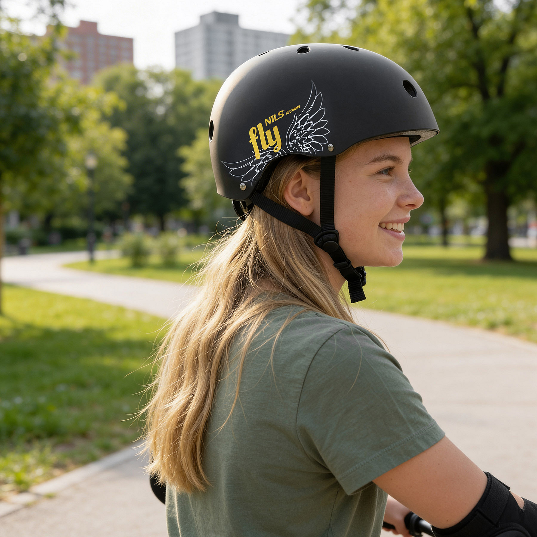 NILS Extreme MTW001 FLY je kvalitní helma typu „ořech“, navržená pro bezpečnou jízdu na kolečkových bruslích, skateboardu a koloběžce. Moderní černý matný design se symbolem křídel dodává helmě stylový vzhled.