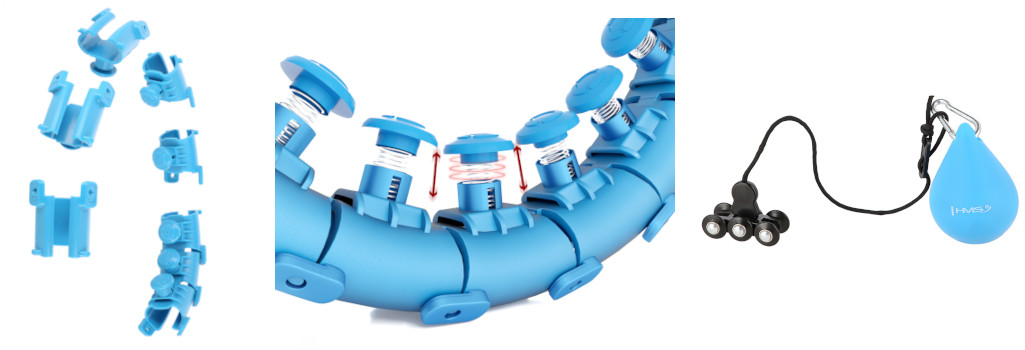 HMS HHW01 se skládá z 24 plastových dílů, které po složení vytvoří rozebíratelnou obruč. Uvnitř obruče tvoří díly kolejnici, do které se před uzavřením vloží "vozík" se 6-ti kolečky na ložiskách, my mu říkáme kotva. Ke kotvě je pevně připojen délkové nastavitelný řemínek (22 - 38 cm), ke kterému se pomocí karabiny připne 400 gramové závaží, které se podobá kouli a tvoří jej guma naplněná pískem. Kotva se během tréninku pohybuje po obvodu obruče a její odstředivá síla zvyšuje intensitu masáže. Každý díl obruče disponuje masážním kloboučkem, který je na pružině a při tréninku slouží k tlumení vibrací vznikajících při pohybu kotvy a zároveň slouží k masáži a prokrvování pokožky. Intensitu masáže ovlivňuje rychlost, jakou kroužíme pasem a délka řemínku, na kterém je připevněno závaží.