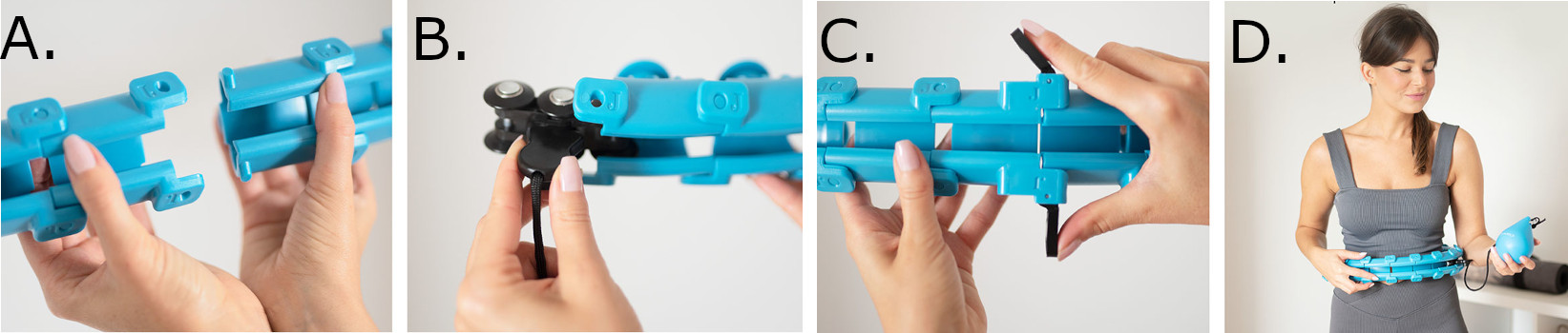 Před zahájením tréninku je potřeba obruč sestavit, jednotlivé díly se do sebe jednoduše zacvaknou (obrázek A.), nastavíme si odpovídající délku obruče tak, aby nám nepadala z oblasti pasu. Do kolejnice vložíme kotvu (obrázek B.), Hula hop nasadíme kolem pasu a uzamkneme jí pomocí dvou páček (obrázek C.). Teď stačí nastavit délku provázku se závažím posunutím táhla a jsme připraveni k tréninku. Závaží hodíme do směru, do kterého budeme točit boky a začínáme trénink.