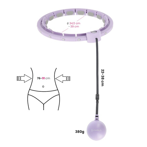 Aby šlo hula hop uzavřít, musíme spojit minimálně 14 kusů, při tomto počtu vznikne obruč s vnitřním průměrem 24 cm, pokud spojíme všechny díly, pak vznikne obruč s vnitřním průměrem 29 cm. HMS HHW09 se oproti klasickému hula hopu nasazuje vcelku na těsno a je tedy ideální pro obvod pasu od 75-ti do 90-ti centimetrů.