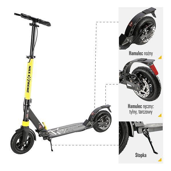 Koloběžka NILS Extreme HM208T je vhodná pro děti i dospělé. Charakteristikou modelu HM208T jsou tlumiče na předním i zadním kole a mechanická, kotoučová brzda.