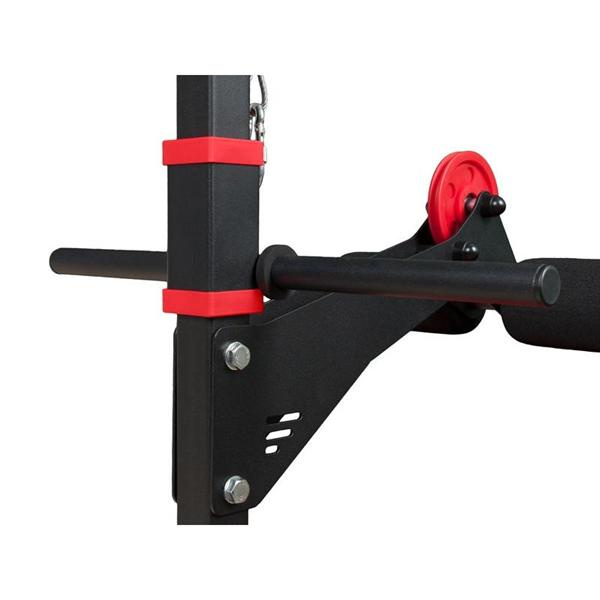 Konstrukce je vyrobena z ocelového profilu 40 x 40 mm na precizních CNC strojích. Zvolený materiál a výrobní postup jsou zárukou bezproblémové montáže, vysoké stability a zatížitelnosti až 130 kilogramů. Jako závaží slouží kotouče (nejsou součástí produktu), které se nasazují na pojezd opatřený dvěma trny s délkou 20 cm a průměrem 25 milimetrů. Závaží se zajišťují pružinovými uzávěry. Pojezd s adaptérem spojuje ocelové lanko s lisovanými oky. Ke každému oku je dodávána karabina pro snadnou výměnu adaptéru, nebo používané kladky. První lanko je zakončeno gumovým dorazem pro ochranu rámu. Samotné lanko slouží k tréninku na horní kladce, pokud chceme trénink upravit na spodní kladku, pak se použije prodlužovací lanko. Samotné kladky jsou plastové s hlubokou drážkou pro přesné vedení lanka a osazeny jsou kuličkovými ložisky. Zarážky lze výškově nastavit do 4 úrovní. Pěnové válce jsou vyrobeny z EVA pěny pro maximální pohodlí.