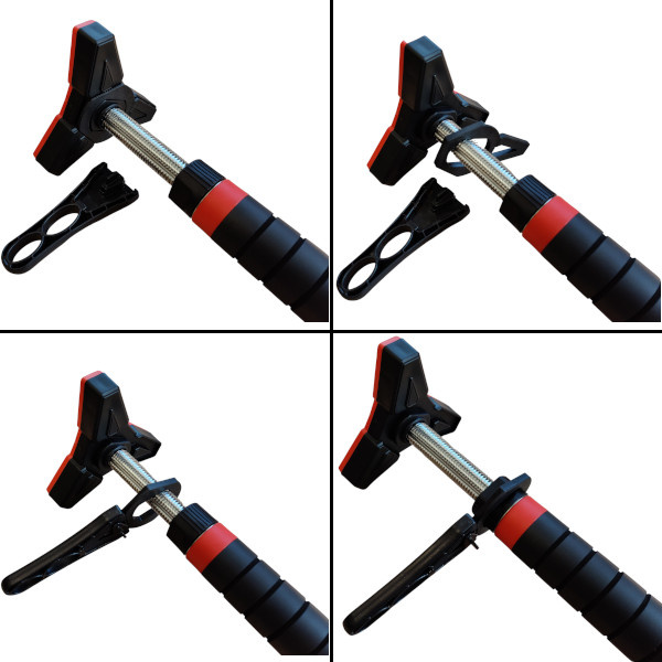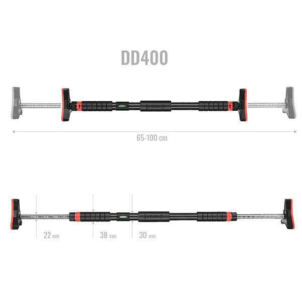 Po vytažení hrazdy z balení se na její konce nasadí koncovky. Hrazdu si na zemi roztáhneme tak, aby byla o několik centimetrů kratší, než je šířka zárubní a dotažením černých matic zajistíme délku hrazdy. DD400 vložíme do zárubní, pomocí dodávané vodováhy ji vyrovnáme a dotáhneme černé matice. Jakmile hrazda drží, tak si z koncovek vytáhneme klíč, který si prodloužíme pomocí nástavce a následně dotáhneme černé matice tak, aby hrazda pevně držela. Nástavec a vodováhu si uschováme pro další použití, klíče nacvakneme zpět do koncovek a můžeme začít s tréninkem.