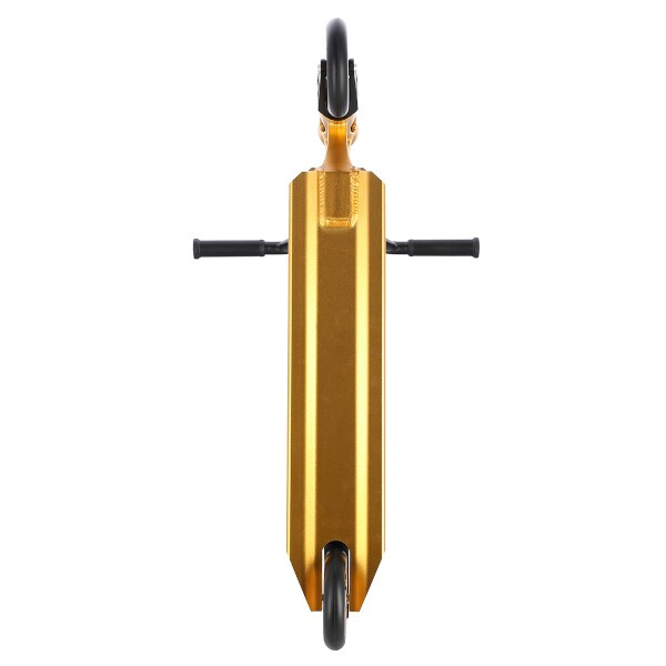 Freestylová koloběžka nemá žádný skládací mechanismus ani systém nastavení výšky řídítek - tyto typy řešení by mohly oslabit celou konstrukci, což samozřejmě není žádoucí u produktu, kde je odolnost zásadní.
