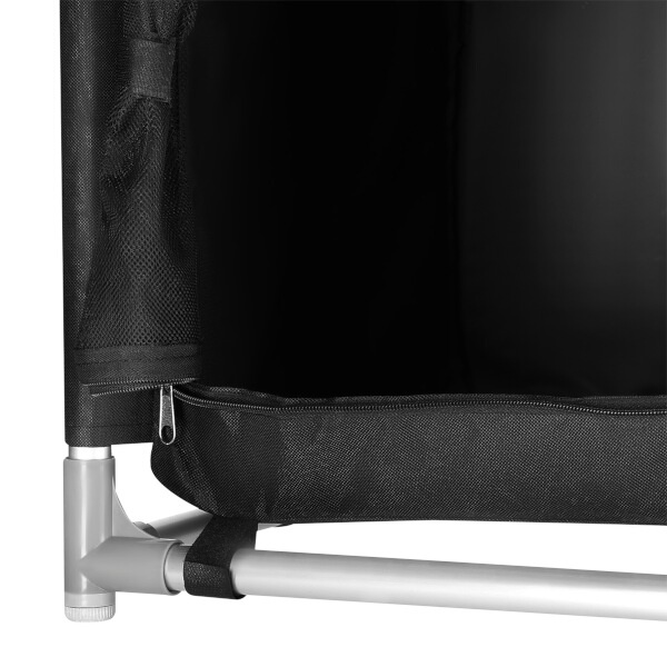 Rám skříňky tvoří hliníkové trubky o průměru 19 milimetrů, které se spojují pomocí plastových spojek. Spodní spojky jsou opatřeny výstupky, díky kterým rám neleží na podkladu, tím odpadá hledání roviny a skříňka tak je stabilní i na nerovném povrchu. Samotná skříňka je vyrobena z polyesteru v úpravě oxford 600D. Tato tkanina je maximálně odolná vůči poškození a povětrnostním vlivům jako je déšť a sníh. Tkanina se navléká na trubky, které se následně spojí a ve spodní části se skříňka vypne pomocí suchých zipů. Do skříňky se následně umístí 3 police z MDF desky a je hotovo. Součástí balení je MDF deska s hliníkovým lemem, která se nasadí na skříňku a slouží jako praktický stůl. Přední panel je vyroben ze síťoviny pro cirkulaci vzduchu, lze jej srolovat ke kraji a zajisti řemínky, nebo uzavřít pomocí dvojitého zipu. Zadní strana skříňky je opatřena neodnímatelnou síťovinou.