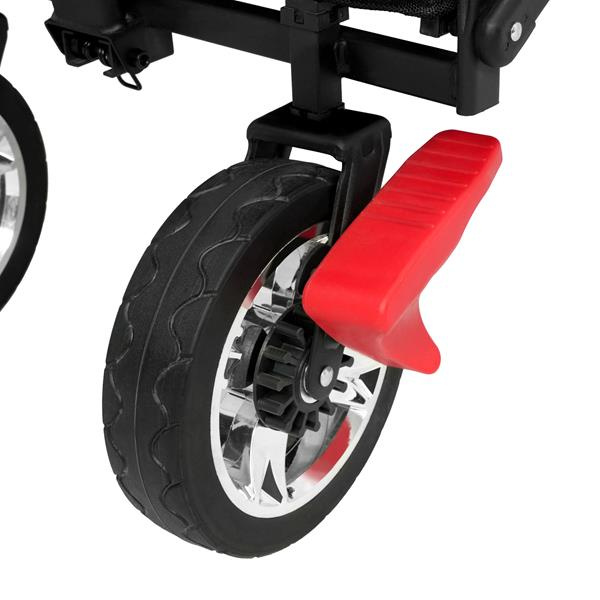 Za hladké vedení zodpovídají čtyři pevná kola o rozměrech 20 x 4,5 cm, vyrobená z kombinace odolného polypropylenu a gumy. Taková konstrukce zajišťuje stabilitu a dobrou přilnavost na různých površích – jak na asfaltu, tak na trávě nebo písku. Nastavitelná rukojeť (v rozmezí 76 až 105 cm) se přizpůsobí výšce uživatele, což významně zvyšuje komfort vedení. Přední kola jsou opatřena brzdami pro zajištění vozíku na místě.