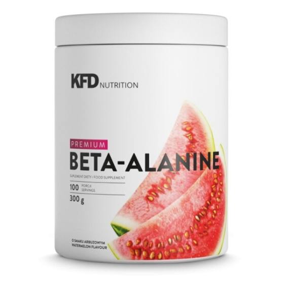 Informace z etikety produktu: KFD PREMIUM BETA-ALANINE (příchuť vodní meloun) je doplněk stravy v prášku obsahující beta-alanin. Obsahuje sladidlo.