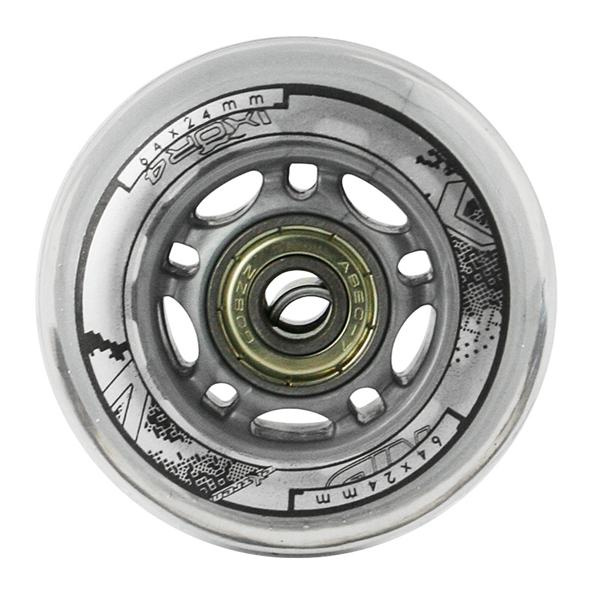 Sestava čirých PU koleček NILS Extreme o velikosti 64 mm a šířkou 24 mm, s ložisky ABEC 7 jsou vyrobeny z polyuretanu, což je kvalitní a odolný materiál. Tvrdost koleček 82A je ideální hodnotou pro pohlcování nerovností, při zachování vysoké přilnavosti k podkladu, takový zlatý střed. Kolečka jsou čiré a mají lehce grafický design v černo šedé barvě. Každé kolečko je osazeno dvěma ložisky ABEC 7 pro plynulou jízdu.