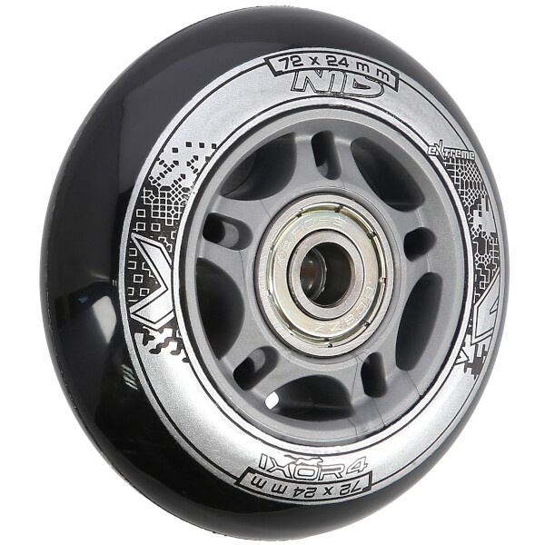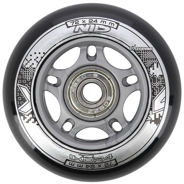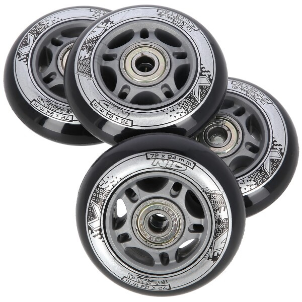 Sestava černých PU koleček NILS Extreme o velikosti 72 mm a šířkou 24 mm, s ložisky ABEC 9 jsou vyrobeny z polyuretanu, což je kvalitní a odolný materiál. Tvrdost koleček 82A je ideální hodnotou pro pohlcování nerovností, při zachování vysoké přilnavosti k podkladu, takový zlatý střed. Kolečka jsou černé a mají lehce grafický design v černo šedé barvě. Každé kolečko je osazeno dvěma ložisky ABEC 9 pro plynulou jízdu.