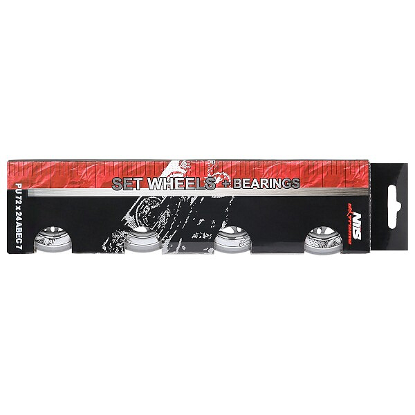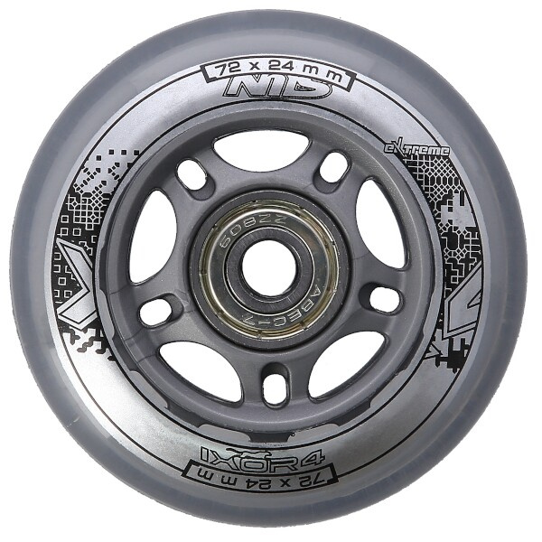 Sestava čirých PU koleček NILS Extreme o velikosti 72 mm a šířkou 24 mm, s ložisky ABEC 7 jsou vyrobeny z polyuretanu, což je kvalitní a odolný materiál. Tvrdost koleček 82A je ideální hodnotou pro pohlcování nerovností, při zachování vysoké přilnavosti k podkladu, takový zlatý střed. Kolečka jsou čiré a mají lehce grafický design v černo šedé barvě. Každé kolečko je osazeno dvěma ložisky ABEC 7 pro plynulou jízdu.