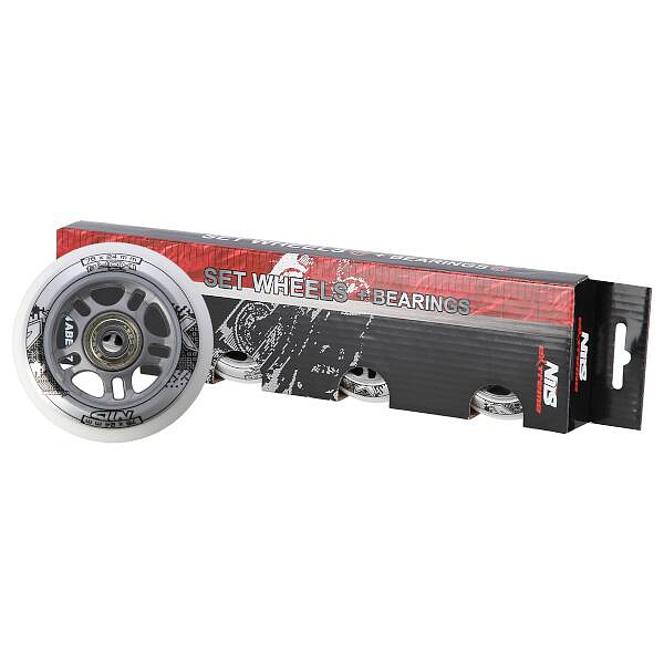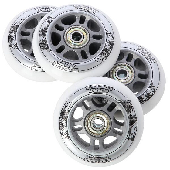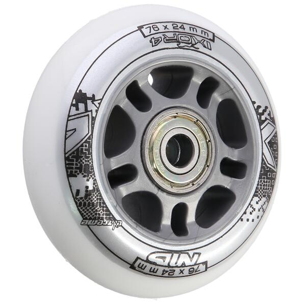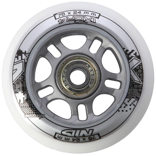 Sestava bílých PU koleček NILS Extreme o velikosti 76 mm a šířkou 24 mm, s ložisky ABEC 7 jsou vyrobeny z polyuretanu, což je kvalitní a odolný materiál. Tvrdost koleček 82A je ideální hodnotou pro pohlcování nerovností, při zachování vysoké přilnavosti k podkladu, takový zlatý střed. Kolečka jsou bílé a mají lehce grafický design v černo šedé barvě. Každé kolečko je osazeno dvěma ložisky ABEC 7 pro plynulou jízdu.