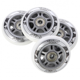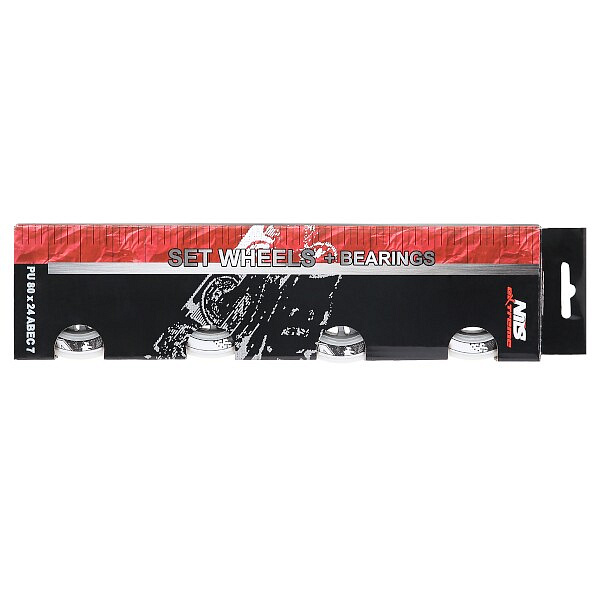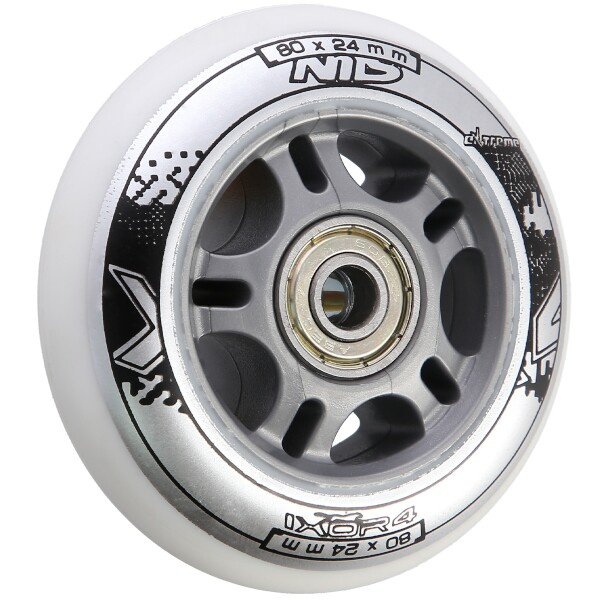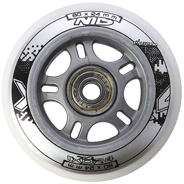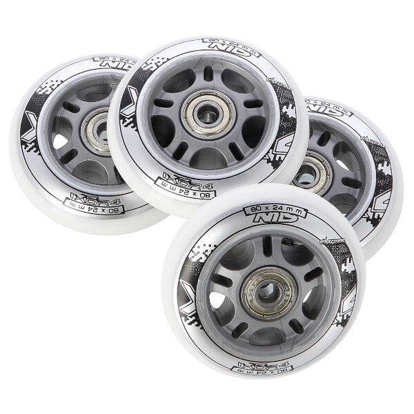 Sestava bílých PU koleček NILS Extreme o velikosti 80 mm a šířkou 24 mm, s ložisky ABEC 7 jsou vyrobeny z polyuretanu, což je kvalitní a odolný materiál. Tvrdost koleček 82A je ideální hodnotou pro pohlcování nerovností, při zachování vysoké přilnavosti k podkladu, takový zlatý střed. Kolečka jsou bílé a mají lehce grafický design v černo šedé barvě. Každé kolečko je osazeno dvěma ložisky ABEC 7 pro plynulou jízdu.