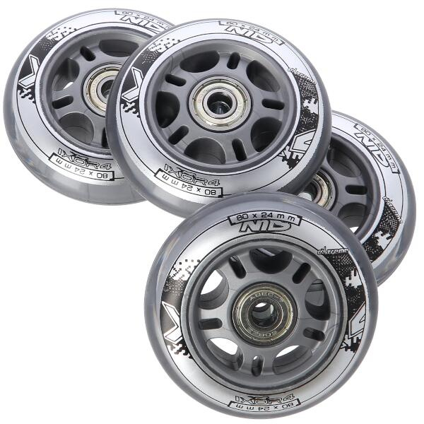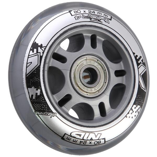 Sestava čirých PU koleček NILS Extreme o velikosti 80 mm a šířkou 24 mm, s ložisky ABEC 7 jsou vyrobeny z polyuretanu, což je kvalitní a odolný materiál. Tvrdost koleček 82A je ideální hodnotou pro pohlcování nerovností, při zachování vysoké přilnavosti k podkladu, takový zlatý střed. Kolečka jsou čiré a mají lehce grafický design v černo šedé barvě. Každé kolečko je osazeno dvěma ložisky ABEC 7 pro plynulou jízdu.