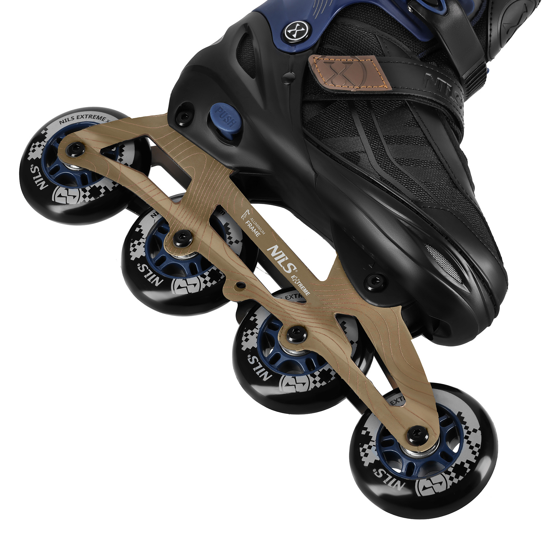 Hliníkový rám zvyšuje odolnost a stabilitu celé konstrukce. Model zároveň nabízí možnost úpravy podvozku – standardní konfiguraci se 4 kolečky lze vyměnit za uspořádání se 3 kolečky o větším průměru. Tím brusle získají svižnější charakter a vyšší rychlost, což ocení uživatelé, kteří chtějí z rekreační jízdy dostat dynamičtější zážitek, ale stále si zachovat pohodlí a kontrolu.