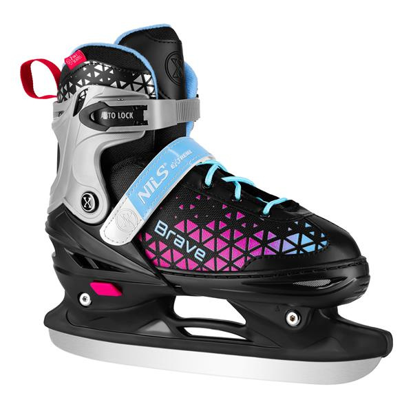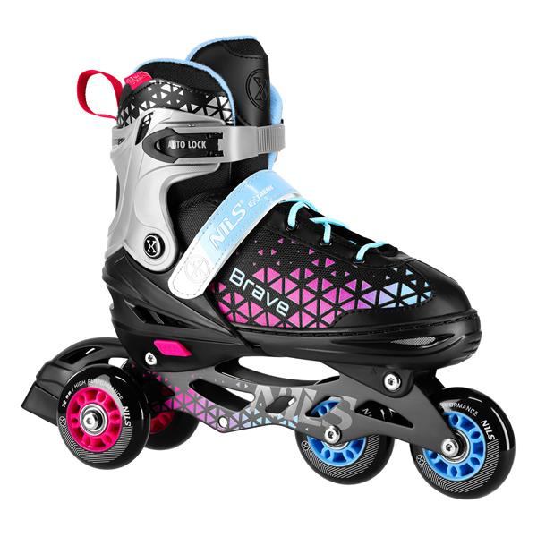 Kolečkové brusle NILS Extreme NH18190A pro rekreační jízdu s PU kolečky a ložisky ABEC 7 a vyměnitelnými noži na led. Zapínání na dvousekční přezku, řemínek se suchým zipem a šněrování. Bota je nastavitelná do 4 velikostí.Více