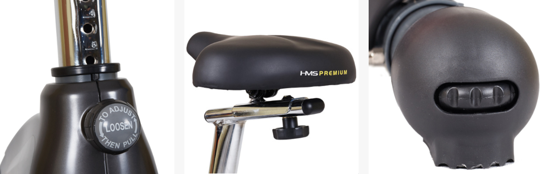 Výška sedlové tyče se nastavuje pomocí ergonomicky tvarovaného šroubu, který stačí potáhnout směrem ven a následně lze upravit výšku sedla, to je umístěno na horizontálně posuvné kolejnici. Samotné sedlo je široké, pohodlné a lze nastavit jeho sklon.