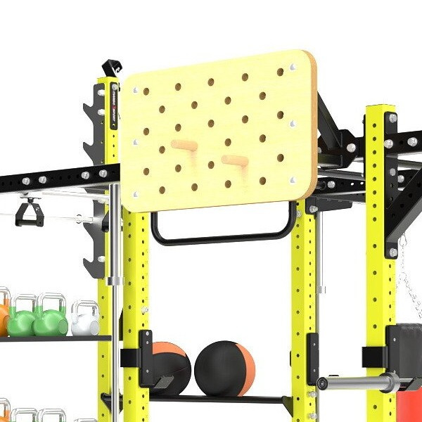 Peg Board je pomůcka k posilování svalů horních partií. Jde o dva kolíky, kterými se přesouváte mezi 27-mi otvory v desce. Ta ma tloušťku 40 mm a zaručuje tak maximální pevnost. Otvory mají průměr 30 mm a vzdálenost mezi nimi je 8 cm. 2 dodávané kolíky mají délku 17,5 cm a skládají se ze dvou částí, kdy první je vkládací a má délku 5 cm s průměrem 30mm. Druhá část je úchopová a délkou 12,5 cm a průměrem 35 mm. Pod deskou je hrazda, která slouží například jako startovní pozice, nebo k "odpočinku". Montáž se provádí pomocí 2 ks dodávaných šroubů.