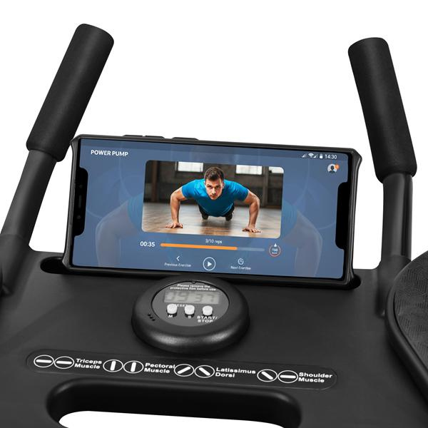 Vestavěný časovač (min/sek) usnadňuje intervaly a držák na telefon umožňuje sledovat tréninkové aplikace nebo instruktážní videa — bez nutnosti držet zařízení v ruce.