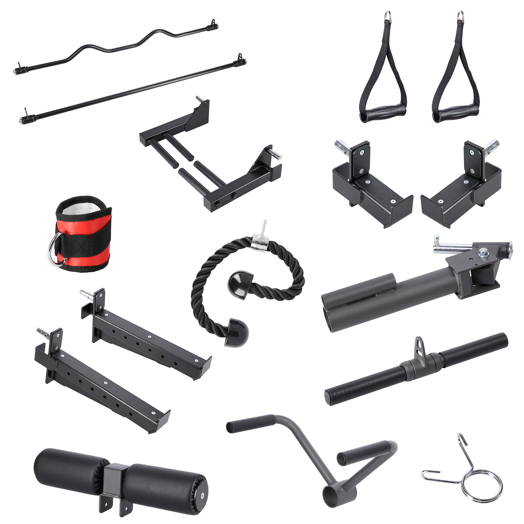 - Adaptéry ke kladkám - 2 jednoruční úchopy, rovná obouruční osa, lomená obouruční osa, popruh na kotník, tricepsové lano, veslovací adaptér a rovný tricepsový adaptér.