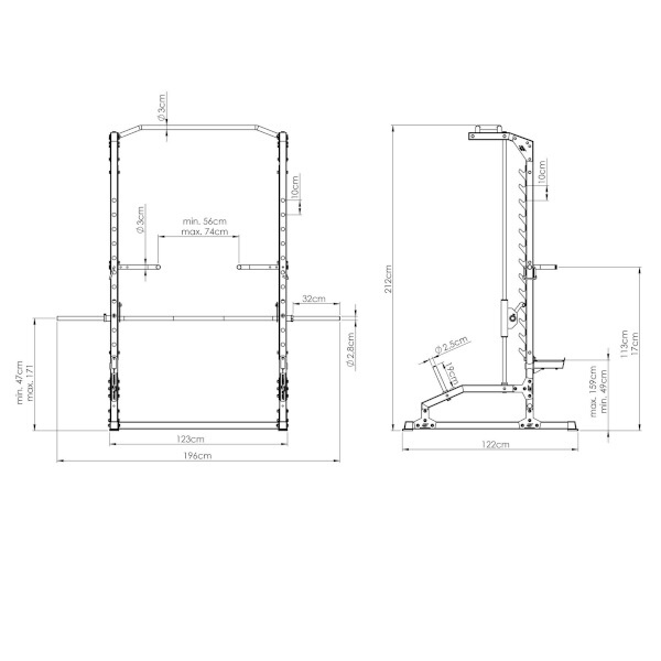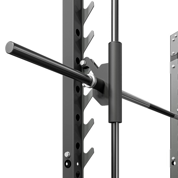 Konstrukce MS-U105 2.0 je vybavena dvěma sadami nastavitelných háků na obouruční činku, které vám umožní uložit činku do optimální výšky pro právě prováděný cvik. Háky lze nastavit v 11 výškových úrovních v rozmezí 49 - 159 cm od země. Tato funkce nabízí skvělé tréninkové možnosti, například umožňuje cvičit dřepy s činkou. Přidáním lavičky k posilovacímu stroji MS-U105 2.0 získáme sestavu, kterou lze s úspěchem použít pro trénink hrudníku.