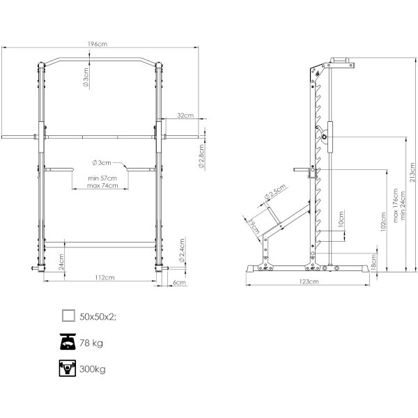 Model MS-U117 2.0 se vyznačuje mimořádně pevnou konstrukcí, která zajišťuje stabilitu i při intenzivním tréninku. Zařízení lze napevno ukotvit k podlaze, což výrazně zvyšuje bezpečnost při práci s těžkými váhami. Gumové patky chrání podlahu před poškrábáním a integrované držáky na kotouče usnadňují jejich praktické uložení. Díky těmto prvkům máte jistotu, že váš trénink bude nejen efektivní, ale také komfortní a bezpečný.