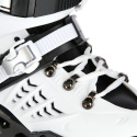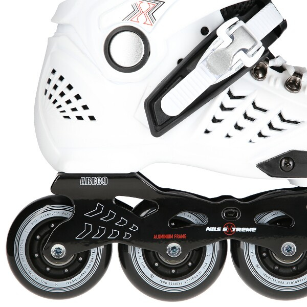 Kolečkové brusle NILS Extreme NA20001 jsou určeny primárně pro freeride a slalom. Jejich konstrukce je založena na lehké, větrané botě s anatomickou stélkou zaručující vysokou stabilitu paty, polypropylenovém skeletu a hliníkové liště vyrobené pomocí vstřikování. Jako zapínání bylo použito šněrování, dvojsekční přezky a kvalitní spony s napínacím mechanismem. Na vnější straně boty nalezneme slider, tak často užívaný při freeridu.