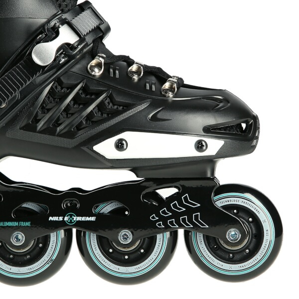 Kolečkové brusle NILS Extreme NA20001 jsou určeny primárně pro freeride a slalom. Jejich konstrukce je založena na lehké, větrané botě s anatomickou stélkou zaručující vysokou stabilitu paty, polypropylenovém skeletu a hliníkové liště vyrobené pomocí vstřikování. Jako zapínání bylo použito šněrování, dvojsekční přezky a kvalitní spony s napínacím mechanismem. Na vnější straně boty nalezneme slider, tak často užívaný při freeridu.