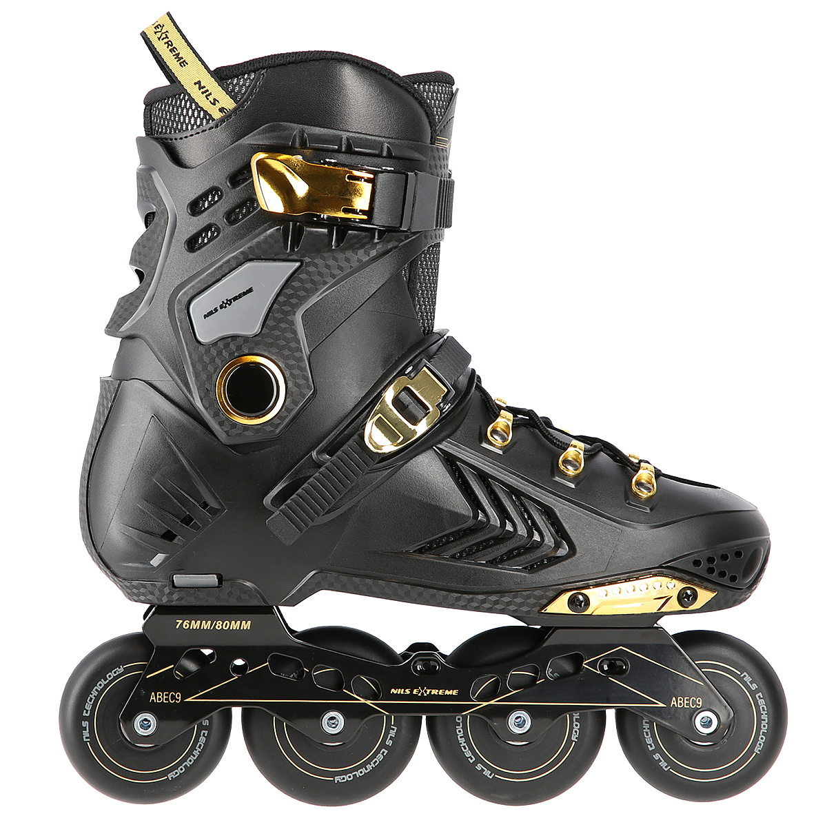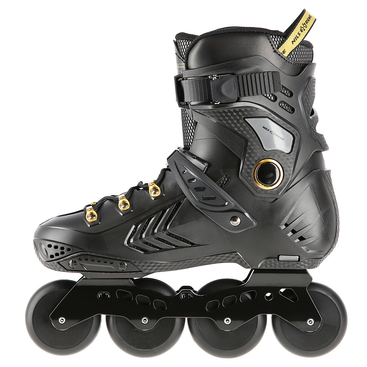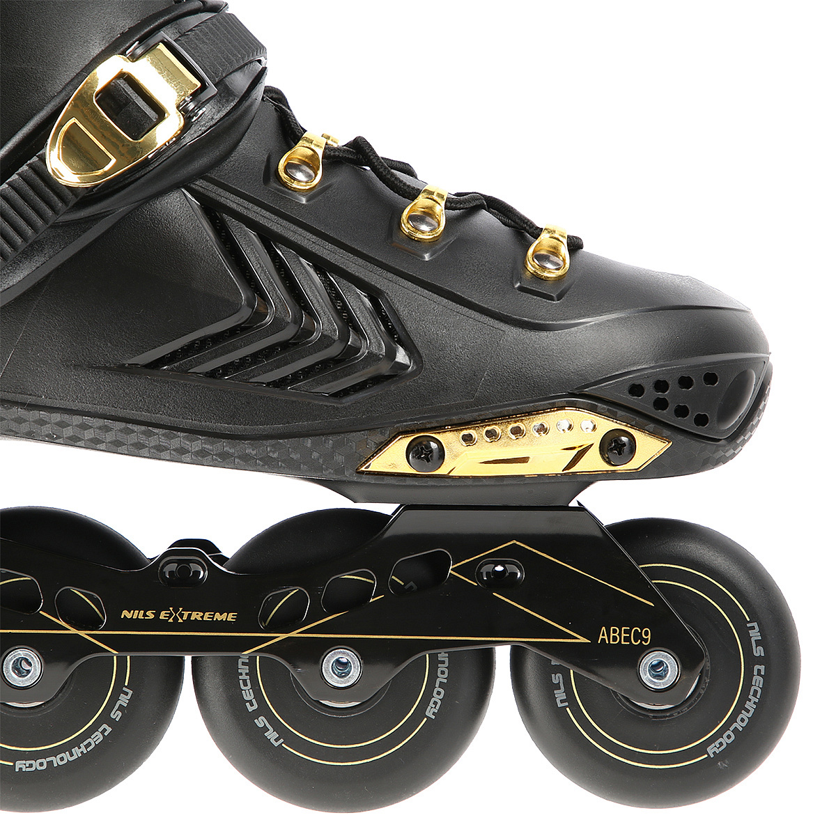 Slalomové a freeride brusle NILS Extreme NA20002 s tvrdou, větranou botou, hliníkovou lištou s kolečky v "slalomovém uložení" a ložisky ABEC 9. Zapínání na dvousekční přezku, napínací přezku a šněrování.Více