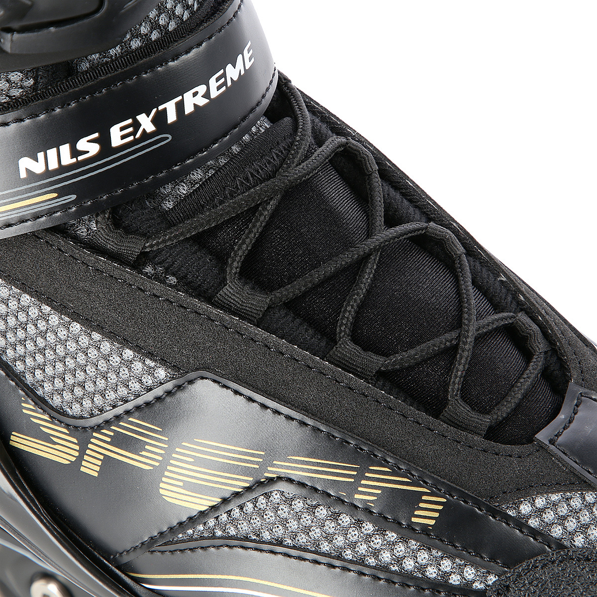 Kolečkové brusle NILS Extreme NA2150 jsou určeny k rekreační jízdě středně pokročilých a pokročilých bruslařů po rovných a hladkých stezkách, jako například po asfaltu. Lehká a odolná bota je vyrobena z kombinace síťoviny MESH a pěny EVA, špička je vybavena ventilačními otvory, tyto vlastnosti zaručují prodyšnost boty, snižují pocení nohy a předchází tak vlhnutí vložky. Systém ventilace a tvarovaná stélka boty tak přímo ovlivňují zvýšení uživatelského komfortu. Sketel modelu NH2150 je vyroben z polypropylenu, který je velice odolný a vydrží i ty nejtvrdší pády, zároveň stabilizuje chodidlo v oblasti kotníku. Bezpečnost brusle zvyšuje zapínání na dvousekční přezku, řeminek se suchým zipem a šněrování. 80-ti milimetrová kolečka s tvrdostí 82A jsou uložena v hliníkové liště vyrobené precizní CNC technologií, dobře přiléhají k podkladu a částečně pohlcují nervnosti. Model NA2150 je osazen ložisky ABEC 9 CHROME, která se vyznačují nízkým odporem, kdy jízda má dobrou setrvačnost a na bruslích tak lze dosáhnout vysoké rychlosti, nebo urazit delší vzdálenost bez vynaložení zbytečné síly.