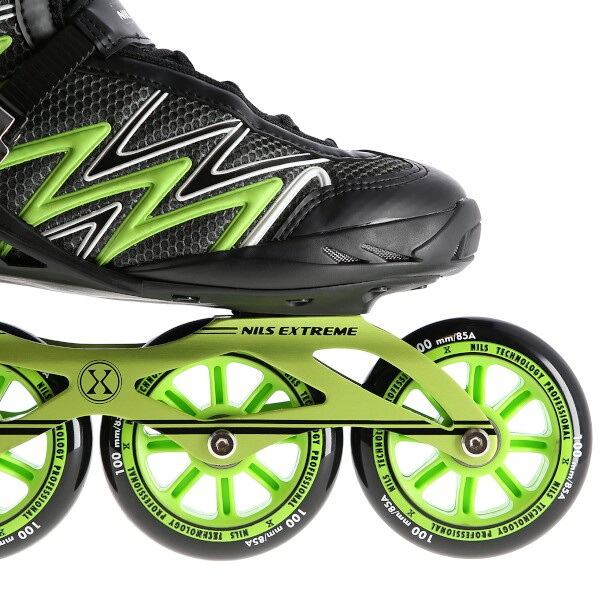 Kolečkové brusle NILS Extreme NA8660 jsou určeny k rekreační jízdě středně pokročilých bruslařů po rovných a hladkých stezkách, jako například po asfaltu. Lehká a odolná bota je vyrobena z kombinace síťoviny MESH a pěny EVA, korpus je vybaven ventilačními otvory, tyto vlastnosti zaručují prodyšnost boty, snižují pocení nohy a předchází tak vlhnutí vložky. Systém ventilace a tvarovaná stélka boty tak přímo ovlivňují zvýšení uživatelského komfortu. Skelet modelu NA8660 je vyroben z polypropylenu, který je velice odolný a vydrží i ty nejtvrdší pády, zároveň stabilizuje chodidlo v oblasti kotníku. Bezpečnost brusle zvyšuje zapínání pomocí dvojice přezek a šněrování. Velká kolečka s tvrdostí 85A jsou uložena v hliníkové liště vyrobené precizní CNC technologií, dobře přiléhají k podkladu a částečně pohlcují nervnosti. Model NA8660 je osazen ložisky ABEC 9, která se vyznačují precizním zpracováním a nízkým odporem, kdy jízda má dobrou setrvačnost a na bruslích tak lze dosáhnout vysoké rychlosti, nebo urazit dlouhou vzdálenost bez vynaložení zbytečné síly. Brusle nemají brzdu.
