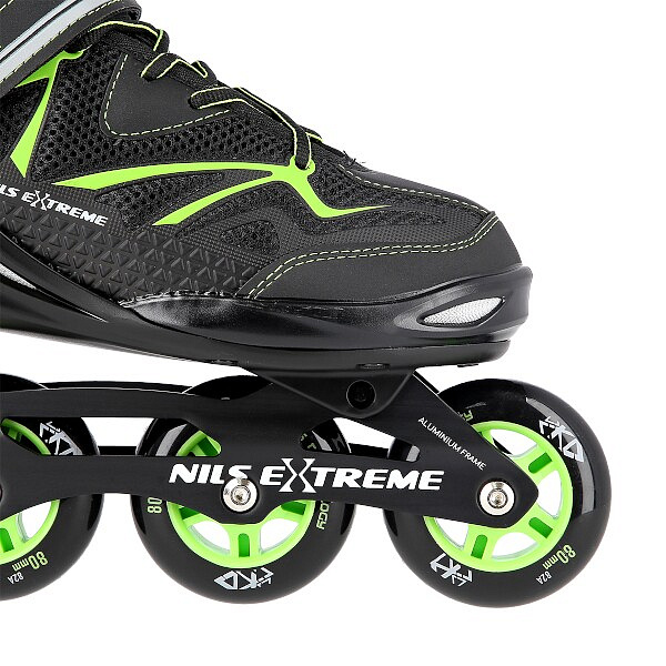 Kolečkové brusle NILS Extreme NA9022 jsou určeny k rekreační jízdě středně pokročilých a pokročilých bruslařů po rovných a hladkých stezkách, jako například po asfaltu. Lehká a odolná bota je vyrobena z kombinace síťoviny MESH a pěny EVA, špička je vybavena ventilačními otvory, tyto vlastnosti zaručují prodyšnost boty, snižují pocení nohy a předchází tak vlhnutí vložky. Systém ventilace a tvarovaná stélka boty tak přímo ovlivňují zvýšení uživatelského komfortu. Sketel modelu NH9022 je vyroben z polypropylenu, který je velice odolný a vydrží i ty nejtvrdší pády, zároveň stabilizuje chodidlo v oblasti kotníku. Bezpečnost brusle zvyšuje zapínání na dvousekční přezku, řeminek se suchým zipem a šněrování. 80-ti milimetrová kolečka s tvrdostí 82A jsou uložena v hliníkové liště vyrobené precizní CNC technologií, dobře přiléhají k podkladu a částečně pohlcují nervnosti. Model NA9022 je osazen ložisky ABEC 9, která se vyznačují precizním zpracováním a nízkým odporem, kdy jízda má dobrou setrvačnost a na bruslích tak lze dosáhnout vysoké rychlosti, nebo urazit dlouhou vzdálenost bez vynaložení zbytečné síly.