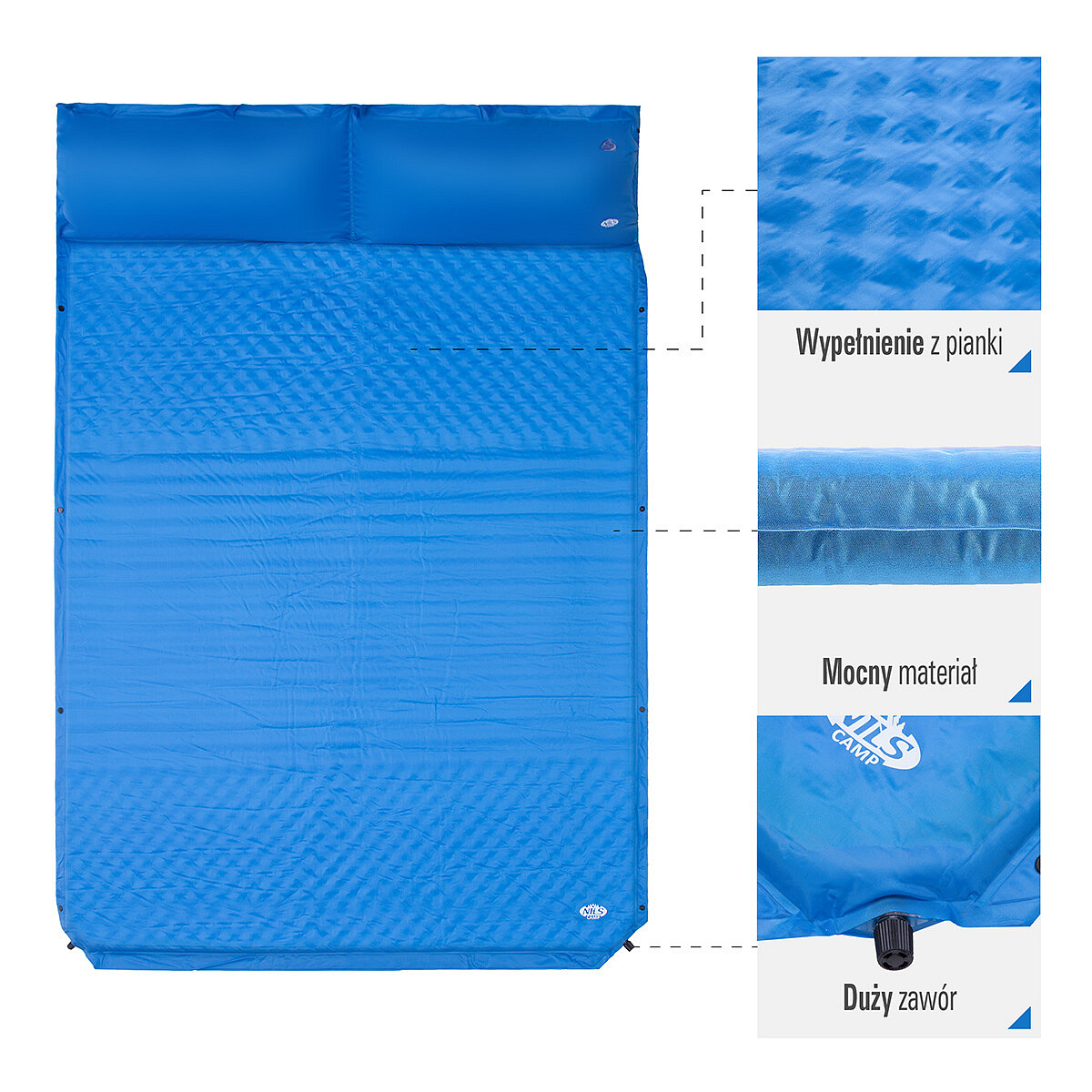 NC4060 NILS Camp je široká samonafukovací karimatka pro dvě osoby, která představuje ideální řešení pro kempování, spaní ve stanu nebo relaxaci na pláži. Nabízí kombinaci pohodlí, jednoduchého použití a praktických detailů pro každou outdoorovou výpravu.