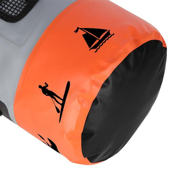 Hlavní komora se uzavírá srolováním a sepnutím přezkou, což zvyšuje těsnost a chrání obsah před zalitím vodou. Nastavitelné ramenní popruhy jsou odnímatelné, takže vak můžete nosit na zádech jako batoh, nebo v ruce, jako klasickou tašku.