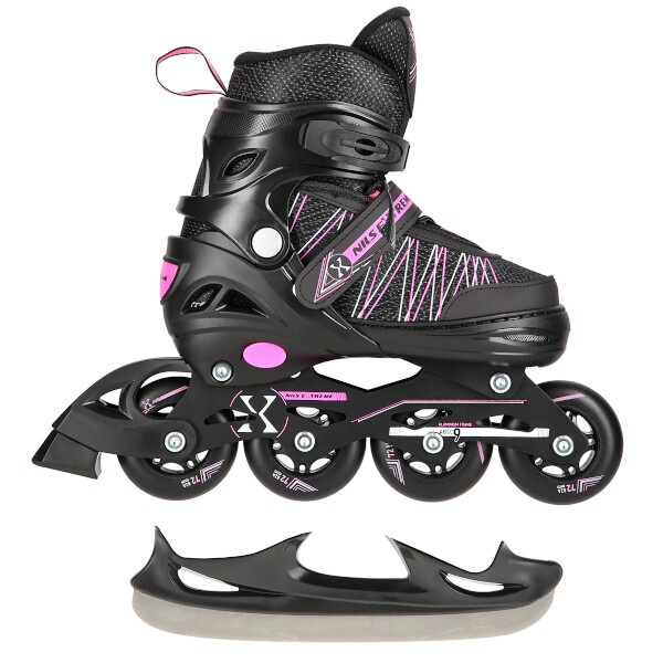 Celoroční brusle NILS Extreme NA11912 A 2v1 mají PU kolečka osazena ložisky ABEC 9, zapínání na trojkombinaci (dvousekční přezka, řemínek se suchým zipem, šněrování) a podvozek vyměnitelný za nůž na led.Více